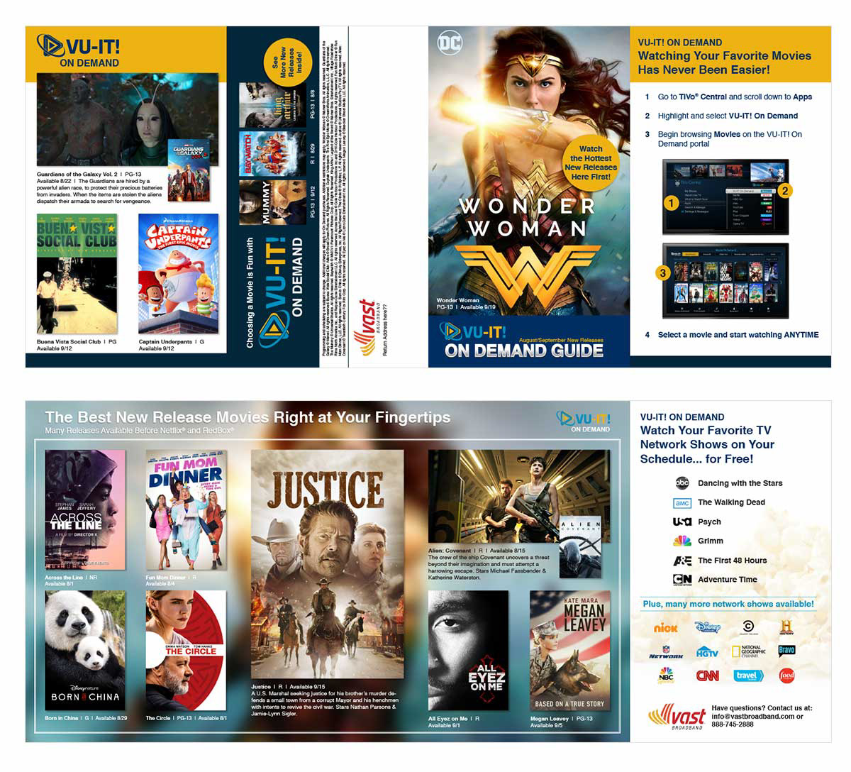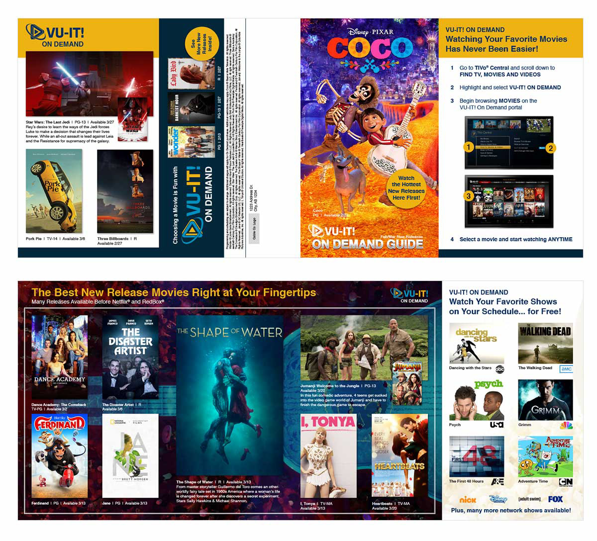 A double gate-fold brochure template for cable operators to notify tv subscribers of On Demand content coming soon.